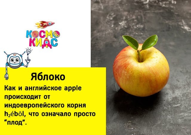 ? Нет, они не растут на одном дереве. Просто в других языках их названия переводятся как… «ЯБЛОКО»! 🍏 Раньше, когда европейцы впервые видели заморские фрукты или овощи, они говорили: «Этот плод похож на яблоко, но растёт по другому или в другой стране». Так и появлялись новые имена. 🍎 А ВОТ ЕЩЁ ИНТЕРЕСНЫЙ ФАКТ Русское слово «яблоко» и английское «apple» — не просто похожи, а настоящие родственники! 👫 У них есть общий прадедушка — древний индоевропейский корень h₂ébōl, который означал просто «плод». Тысячи лет назад, когда люди говорили на одном языке, это слово разошлось по разным народам, но осталось узнаваемым. Поэтому мы говорим «яблоко», англичанин — apple, немец — Apfel, а литовец — obuolys. Все они говорят об одном и том же, хоть и по-разному! А теперь — смотрим на карту путешествий! 👇 🍊 АПЕЛЬСИН Это слово пришло к нам из голландского языка. Там оно звучало как appelsien. А переводится просто: «Яблоко из Китая» (Appel — яблоко, Sina — Китай). Раньше европейцы думали, что
