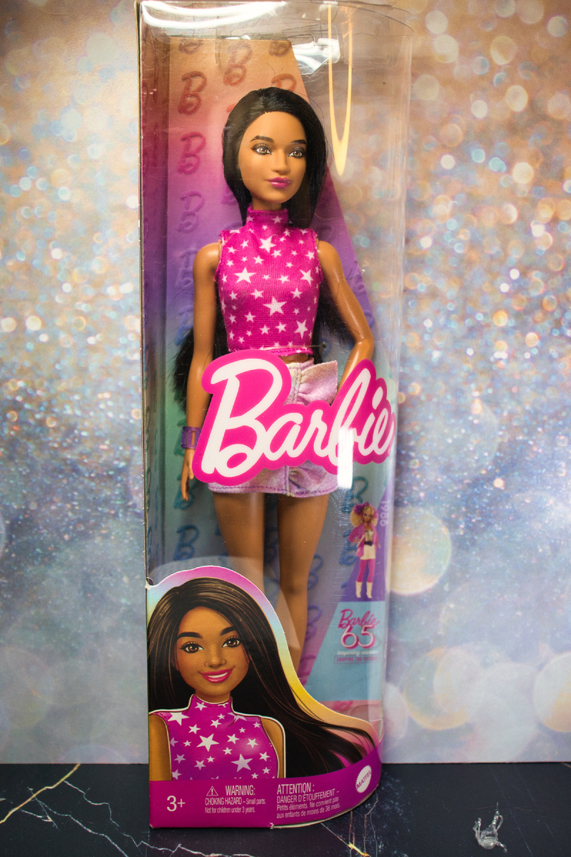 На очереди предпоследняя девочка с той самой распродажи. Эта кукла – привет из 1986 года. Она входит в юбилейную серию к 65-летию Барби и вдохновлена легендарной линейкой Barbie and the Rockers. Звёздный принт на топе – это прямая цитата из того образа: именно такие блестящие детали и были визитной карточкой "рокерш". Такая вот ниточка преемственности длиной в сорок лет. Первое впечатление от неё – какая красивая знойная латиноамериканка! Яркий выразительный макияж, длинные блестящие волосы с красивым отливом, смелые черты лица. И снова незнакомый молд! Статичное, с одной согнутой рукой. Фигура у девочки очень красивая, ничего менять не хочется! А вот сам наряд получился немного пресный: все оттенки пастельные, и нет того контраста, который мог бы дать образу настоящий рок-н-ролльный характер. Так что я пошла на компромисс. Топ со звёздным принтом оставила – он несёт в себе ДНК "рокерш", поэтому должен был остаться. А вот юбку заменила на штаны от йоги-пучка. Они подчёркивают фигуру и