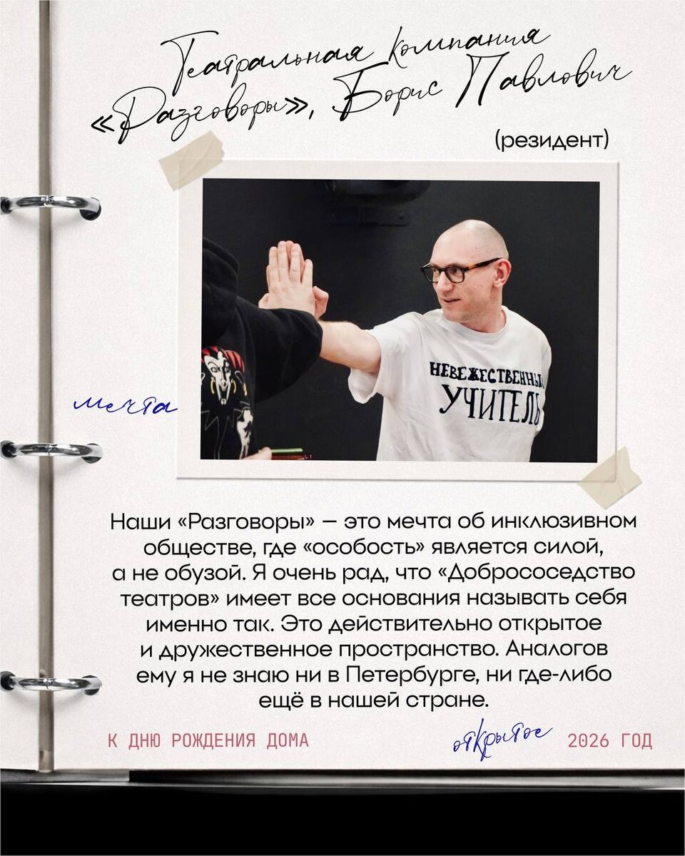 ! Наши дорогие друзья, спасибо каждому за ценные слова! Мы с теплом будем возвращаться к этим страницам нашей истории и с уверенностью идти вперед, продолжая создавать, расти и наполнять это пространство любовью❤️ Завершает главу наших друзей-резидентов театральная компания «Разговоры» и ее руководитель Борис Павлович! «С Домом судьба нашего коллектива связана очень близко. Ровно два года (с 1 апреля 2024 года) мы являемся его резидентами. Мы инклюзивный проект, и безопасное пространство – непременное условие существования. То, как люди общаются, снимают уличную обувь, заваривают кофе или чай, приветствуют друг друга и прощаются, не менее значимо, чем художественные решения. Любопытный факт: с 2017 по 2019 год у нас была «Квартира». Мы с фондом «Альма Матер» создали культурное пространство в настоящей коммуналке. Это был эксперимент по синтезу театра, коммуникативных практик, социального моделирования. Теперь, получается, мы из квартиры перебрались в большой дом –густонаселенный, ш