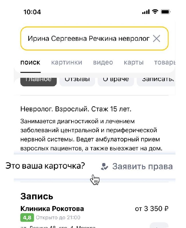 ?) Яндекс всё активнее внедряет продукт «Яндекс Медицина» в поисковую выдачу. Теперь врачи отображаются напрямую в результатах поиска — ещё до сайтов и клиник. За последние недели я получил десятки вопросов по этой теме, поэтому — небольшой ликбез, как работает площадка и что нужно сделать, чтобы ваши специалисты там были. 📍 1. Где отображаются врачи Врачи появляются в поиске по запросу «специализация + ГЕО». Например: «Проктолог Красные ворота» (зкучит как прозвище😹 ) Яндекс покажет подборку докторов, которые ведут приём рядом с этой станцией метро. Если вашего врача там нет — значит, профиль ещё не создан или не подтверждён. 🧾 2. Как подтвердить профиль врача 1️⃣ Введите в Яндексе свои фамилию, имя и специализацию. 2️⃣ В карточке врача нажмите «Заявить права» → войдите через Яндекс ID. 3️⃣ В открывшемся окне выберите «Создать». 4️⃣ Проверьте фото, город, специализацию — при необходимости поправьте. 5️⃣ Заполните раздел «О себе», добавьте образование, карьеру и достижения. 6️⃣
