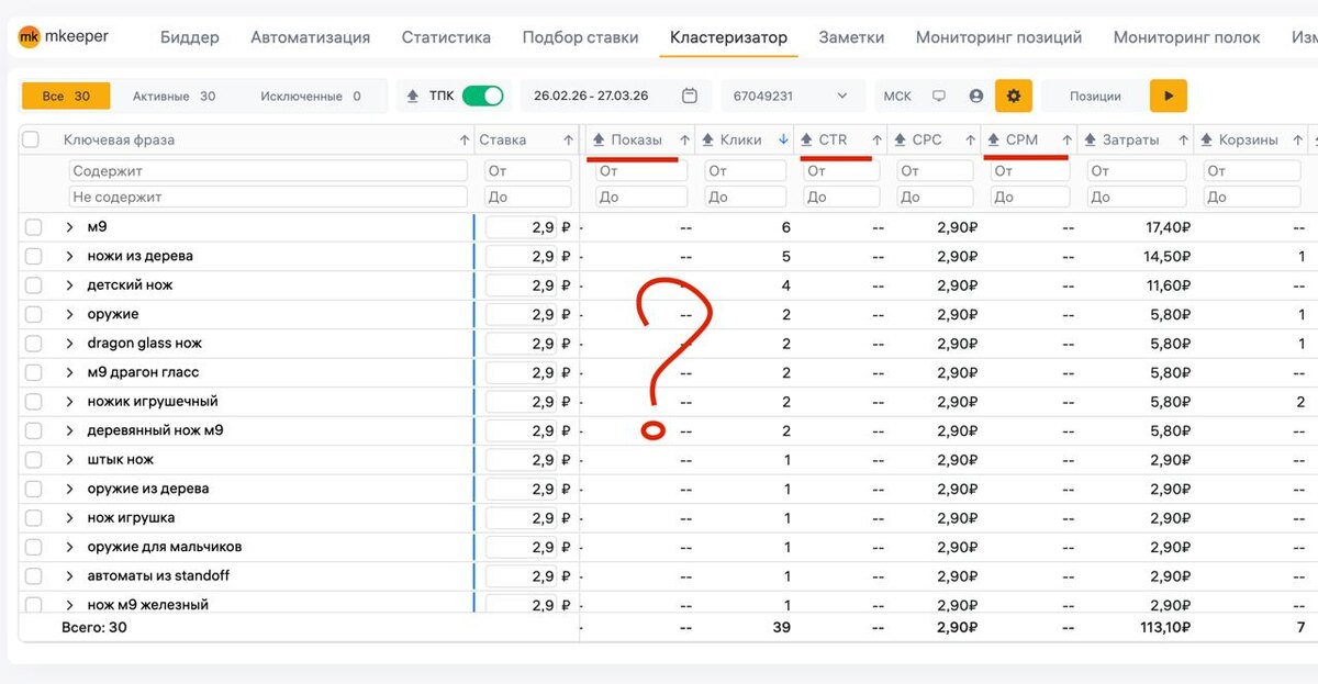 ?) Там нет количества показов🤣 Соответственно мы не можем посчитать CTR по кластеру и расчетный СРМ чтобы сравнить, а что нам выгоднее СРС или СРМ. А раньше эти данные были...