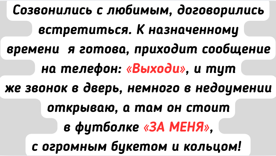 - Созвонились с любимым, договорились встретиться. К назначенному времени я готова, приходит сообщение на телефон: «Выходи», и тут же звонок в дверь, немного в недоумении открываю, а там он стоит в футболке «ЗА МЕНЯ», с огромным букетом и кольцом! «Выходи, за меняя!» Как же я счастлива, не передать!