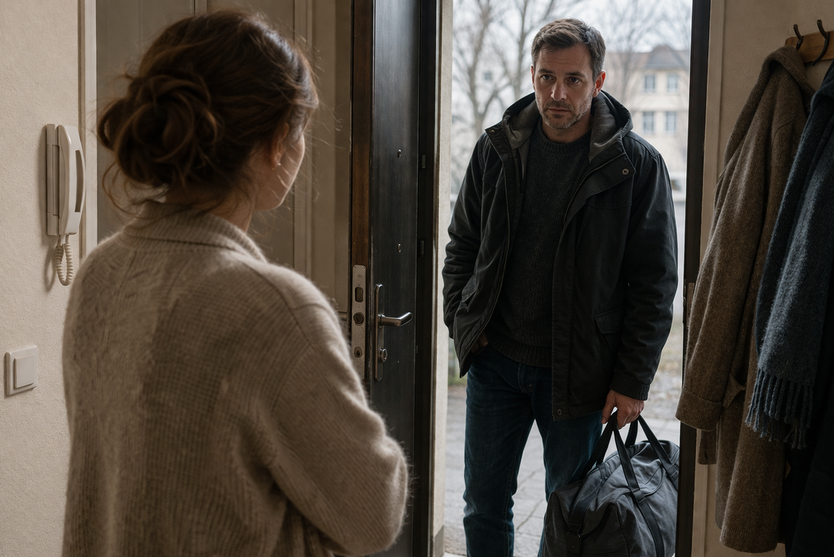 Он стоял у двери с той же привычкой держать плечи чуть поднятыми, будто заранее ждал удара. С дорожной сумкой, не новой, с замятой ручкой, и почему-то без куртки, хотя на лестничной клетке тянуло холодом. Я не сразу открыла шире. Сначала посмотрела в глазок, потом просто застыла, потому что за восемь лет можно сколько угодно убеждать себя, что человек ушёл навсегда, но лицо всё равно узнаётся сразу. Даже если осунулось. Даже если виски уже серые.