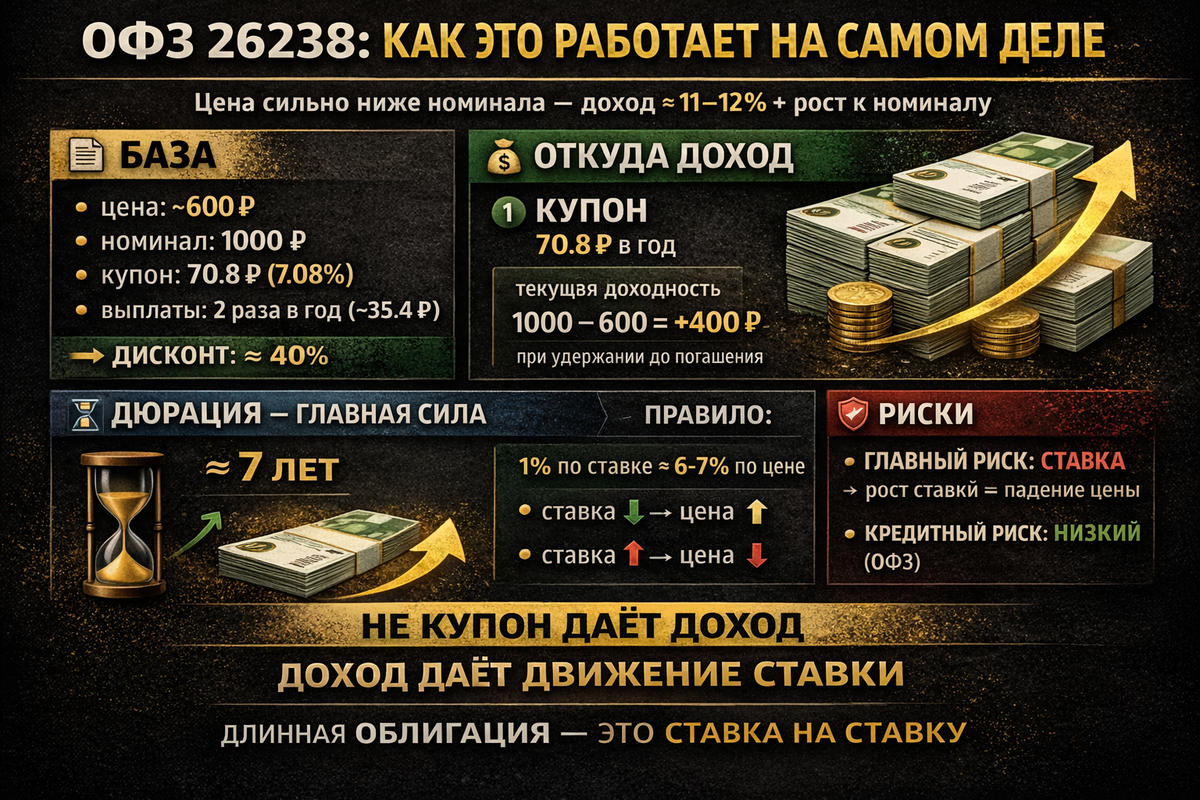 👉 но рынок здесь играет совсем в другую игру 📉 Что рынок на самом деле продаёт Факты: вы покупаете 1000 ₽ за 600 ₽ И это уже говорит о многом. ОФЗ 26238 — это не просто облигация. Это два слоя: 💵 1. Кэшфлоу 👉 это ≈ 11–12% годовых Это базовая доходность. Пока вы держите бумагу — вам платят. 📈 2. Ставочная позиция Вот где начинается самое интересное. 📉 ставка падает на 1%👉 цена растёт примерно на 6–7% 📉 ставка падает на 2–3%👉 цена даёт уже +12–18% ⚠️ Чаще ближе к нижней границе Формула даёт ориентир: 👉 дюрация × изменение ставки Но в реальности движение слабее: Вы не купили «облигацию под 7%». Вы купили: 👉 денежный поток + ставочную позицию 👉 1% по ставке ≈ 6–7% по цене Это:👉 встроенное плечо Без: Вторая сторона медали. 📈 ставка растёт на 1%👉 цена падает на ~6–7% 📈 ставка растёт дальше👉 просадка становится уже «акционного» порядка 🔥Облигация кажется безопасной.