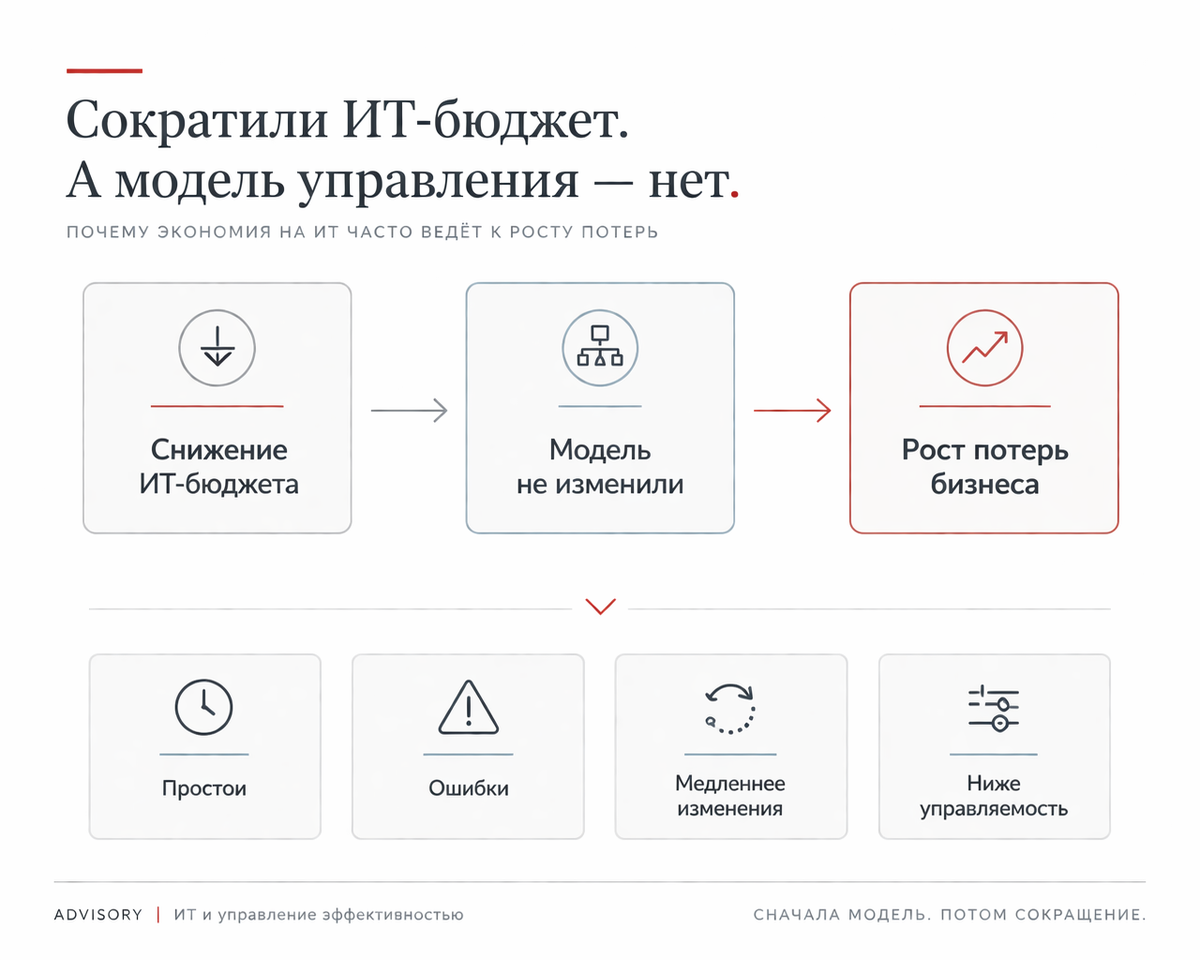 «Так сказал собственник». И вот здесь для CEO и собственника начинается главное. Если ИТ-руководитель просто режет бюджет по команде, не меняет модель работы, не считает последствия и не управляет ими, это не управление стоимостью функции. Это механическое ухудшен