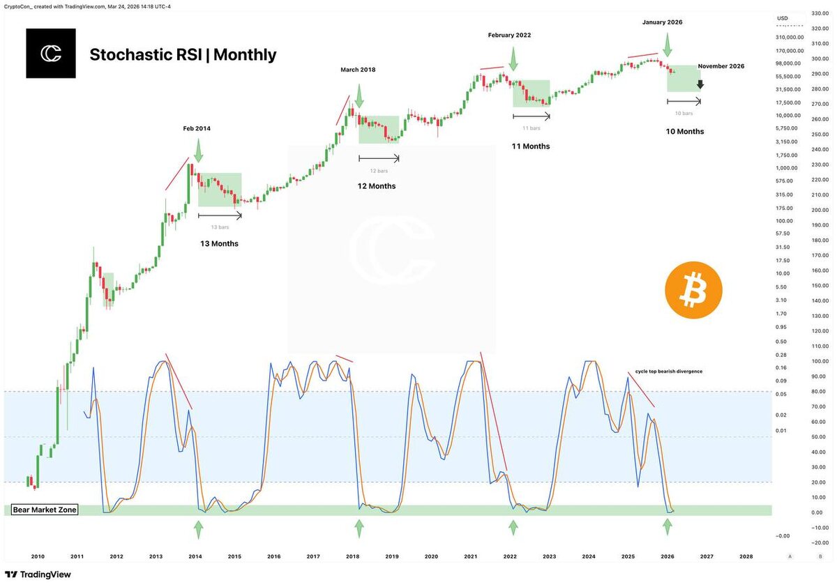 Мы зашли в зону, которую большинство игнорирует, пока не становится слишком поздно. На месячном Stochastic RSI биткоин снова оказался в bear market зоне. Ровно так же, как это происходило в предыдущих циклах. Если отталкиваться от истории: 2014 — ~13 месяцев снижения 2018 — ~12 месяцев 2022 — ~11 месяцев Сейчас модель указывает примерно на 10 месяцев давления, с потенциальным окончанием ближе к ноябрю. И это интересно, потому что… Это почти идеально накладывается на логику халвинг-циклов. Но здесь начинается самое важное. Рынок сейчас находится в той стадии, где появляется мысль: “Слишком очевидно… значит не сработает” И вот это — классическая ловушка. Что это значит? Циклы почти никогда не ломаются полностью. Они адаптируются. Не через “всё будет иначе” А через нюансы: — более резкие откаты — более сложная структура — больше ложных движений — больше выносов до финального дна Но сам ритм… Он сохраняется. Что будет дальше? Если сценарий повторяется, то мы сейчас не в на