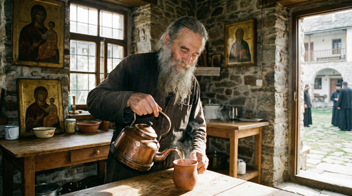 Отец Алексий жил в келье при старом саде. Когда я вошёл, он сидел у окна и чинил что-то вроде старой лампы. Был он худой, седой, с очень простым лицом. Не “иконописный старец”, а скорее бывший сельский учитель, который много видел и давно перестал говорить лишнее.