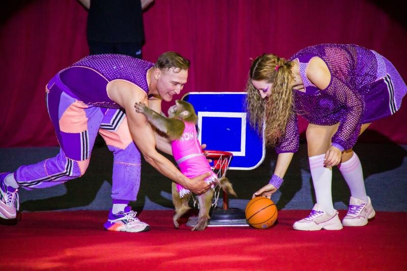 Участвуют и самые маленькие: крошечный малыш, который даже на тумбе пока сидит вместе с мамой, прыгает через кольцо. Бросается в глаза трогательная деталь: дрессировщикам ни разу не пришлось награждать мохнатых артистов угощением. Зато после каждого выполненного трюка обезьянку непременно обнимают и нежно гладят.