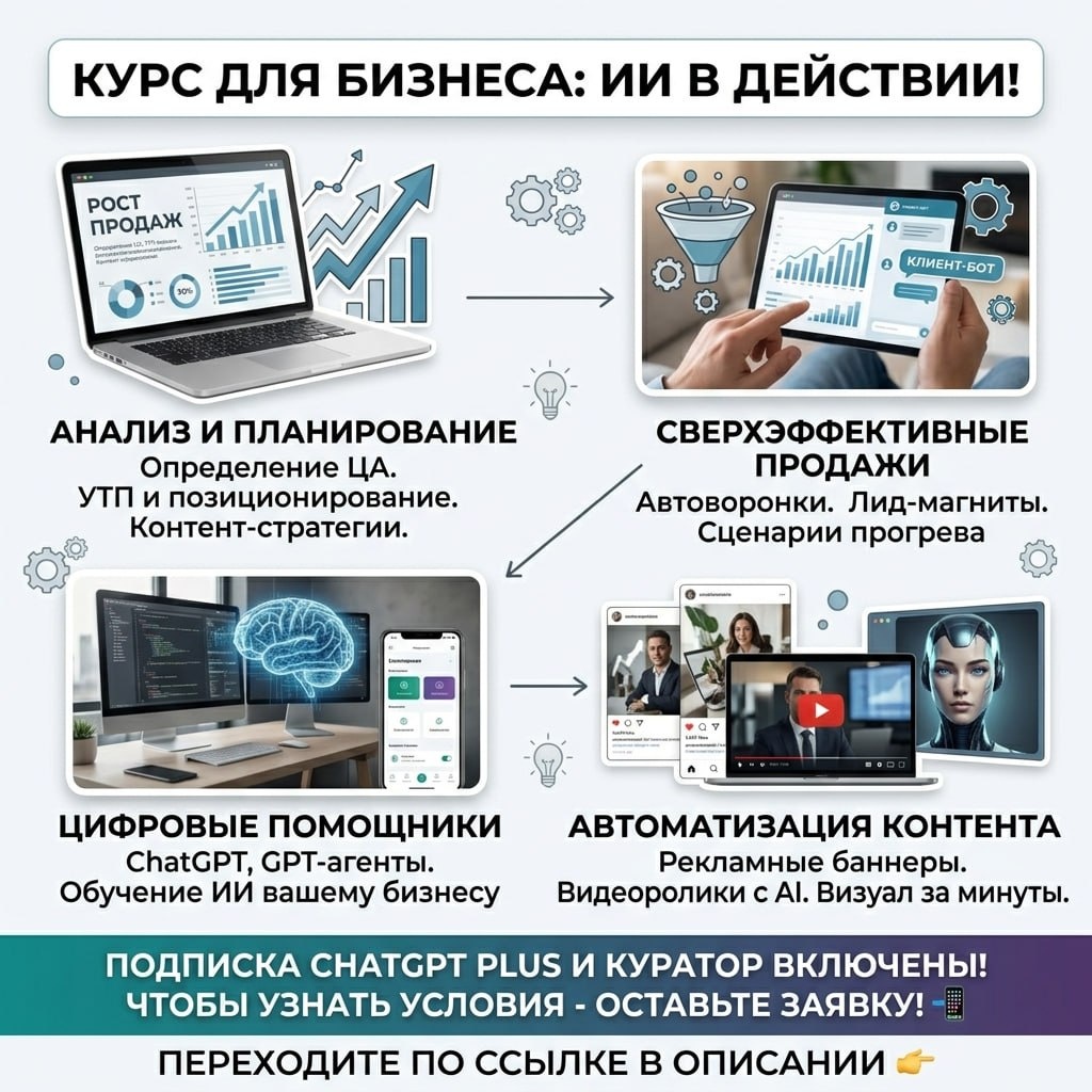 " Отдельный курс для предпринимателей - для тех, кто ведет бизнес и хочет, чтобы ИИ реально работал на него. 4 недели, 10 модулей, каждый заточен под практику на вашем бизнесе. Что внутри, коротко. ▫️Начинаем с фундамента - как ставить задачи ChatGPT так, чтобы он выдавал рабочий результат с первого запроса. Правильный промпт - это разница между "фигня какая-то" и "о, можно сразу в дело". ▫️Дальше - распаковка бизнеса через ИИ. Кто ваш клиент, чего он боится, что его цепляет, как сформулировать предложение так, чтобы оно попадало в точку. На выходе - готовое позиционирование и УТП. ▫️Потом контент и продающие тексты. Контент-план на месяц, логика прогрева, тексты, которые продают. То, за что вы платите копирайтеру 30-50 тысяч, собираете сами за пару часов. ▫️Отдельный блок - воронка продаж. Лид-магнит, сценарии прогрева, путь клиента от первого касания до оплаты. Собираете под свою нишу прямо на курсе. ▫️Создаете собственного GPT-агента - цифрового сотрудника, который знает ваш бизн