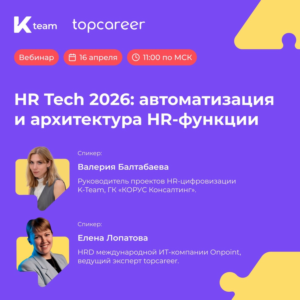 Полдня уходит на ручные сверки и согласования. Руководители забывают ставить задачи, новички пропадают из виду в первую неделю, а вы вместо стратегии снова бесконечно администрируете Excel. Знакомо, коллеги? HR просто вынужден постоянно «допиливать», догонять и напоминать. А вместо управления людьми вы вынуждены пытаться управлять хаосом. Мы в topcareer часто видим эту ситуацию у HR-команд. И ключевая проблема здесь не в людях, а в отсутствии системной архитектуры процессов. Поэтому вместе с K-Team (ГК «КОРУС Консалтинг») мы проводим практический вебинар, на котором разберём, как перейти от хаотичной операционки к управляемой системе. 🗓️ 16 апреля в 11:00 (МСК) «HRTech 2026: автоматизация и архитектура HR-функции» ➡️ О ЧЕМ ПОГОВОРИМ: 🟣 Как меняется роль HR с приходом цифровых инструментов и ИИ 🟣 Почему сотрудники и руководители боятся автоматизации и что с этим делать 🟣 Тренды HRT Tech 2026: чего на самом деле хочет бизнес 🟣 Типичные ошибки при выборе HRM-платформы и как их