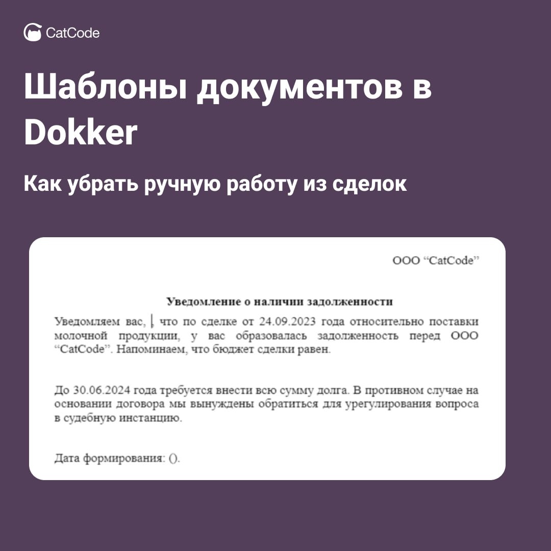 Теперь не нужно каждый раз копировать, править и проверять. Создали шаблон и используете его во всех сделках. Подробная инструкция по настройке и использованию доступна в документации CatCode. Скачать виджет можно здесь.