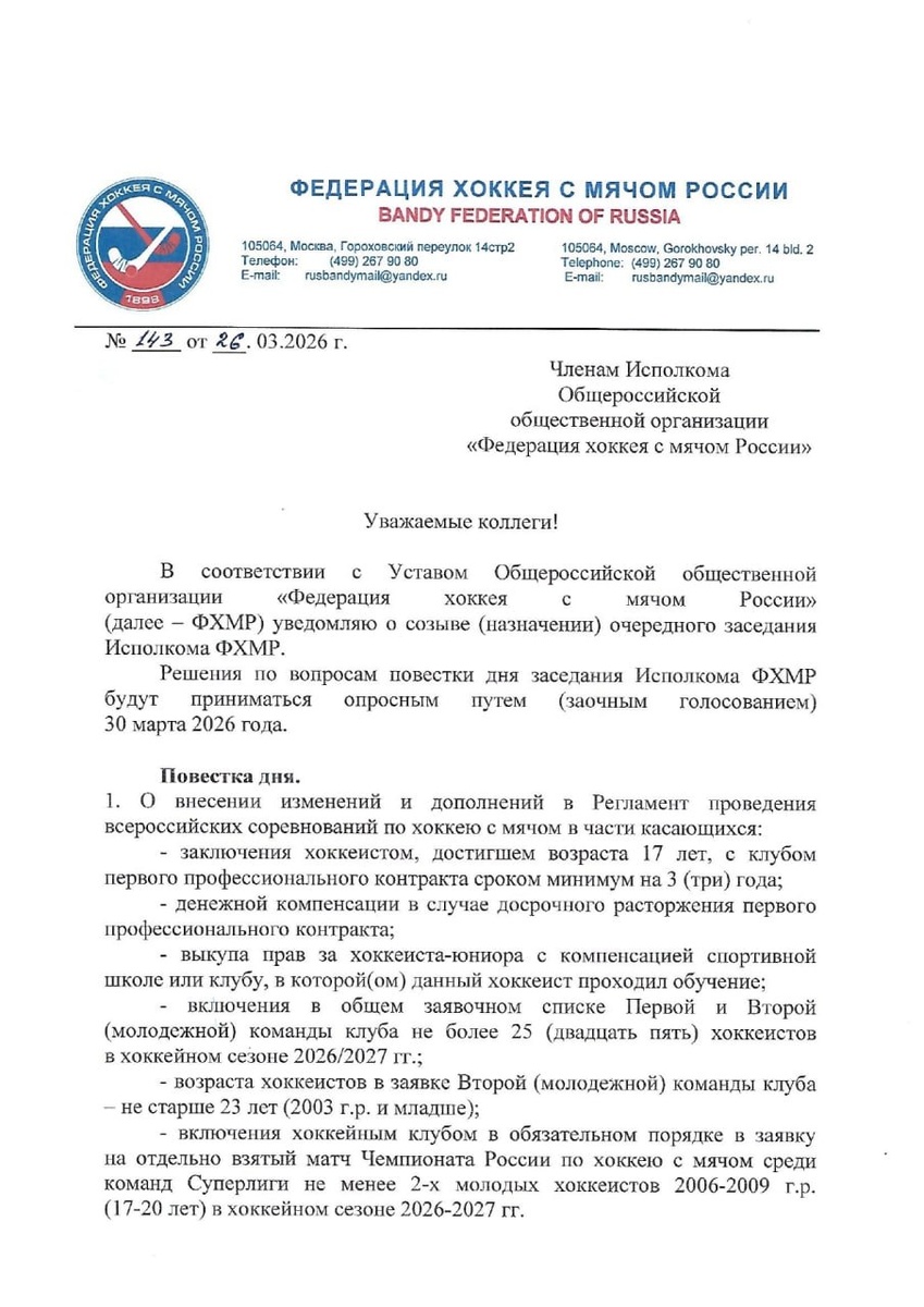 Стала известна повестка дня заседания Исполкома ФХМР. Само заседание пройдет 30 марта в заочном формате Основные вопросы повестки дня: - Изменения в регламенте соревнований, включая: - Обязательный трёхлетний контракт для игроков с 17 лет. - Компенсации при досрочном расторжении первого контракта. - Выплаты спортивным школам за подготовку юниоров. - Ограничение заявочного списка клуба до 25 игроков. - Возрастной лимит для молодёжной команды — не старше 21 года. - Обязательное включение в заявку на матч минимум двух молодых игроков (2006–2009 г.р.).