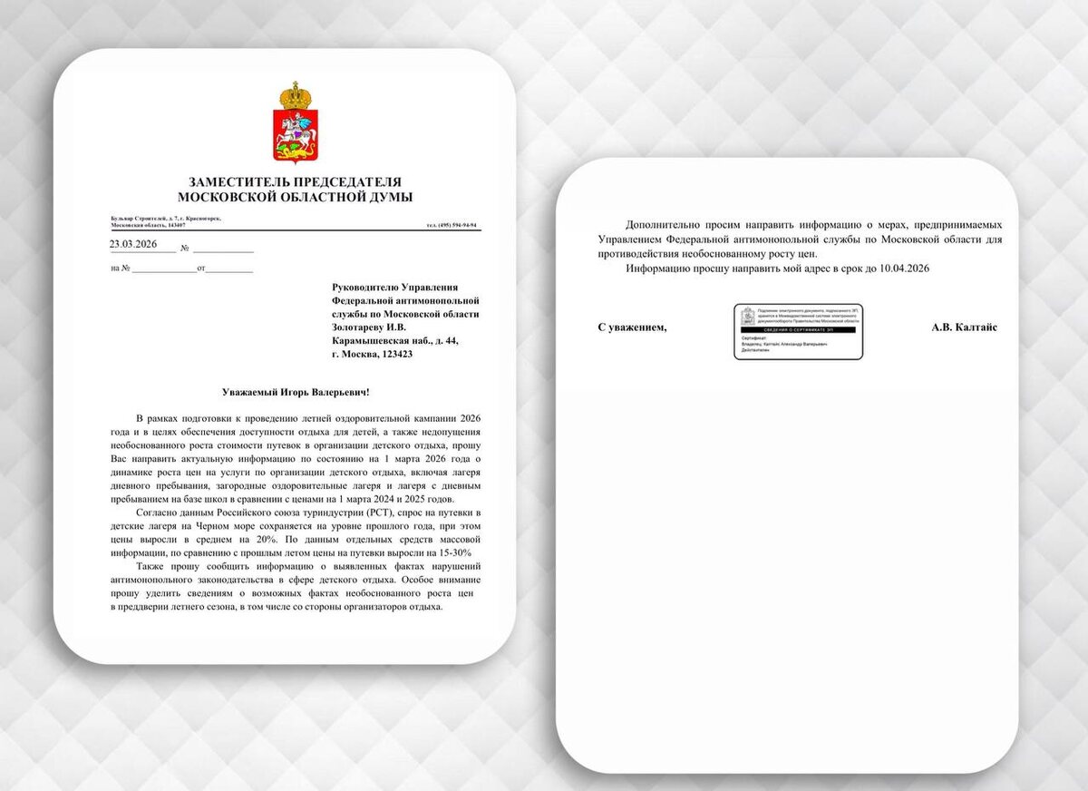 Качественный и безопасный отдых для наших детей – это не просто желание, это приоритет! Именно с таким убеждением фракция ЛДПР в Мособлдуме подходит к предстоящей летней оздоровительной кампании 2026 года. Мы не можем допустить, чтобы на здоровье и радости наших детей кто-то наживался. Поэтому руководитель фракции ЛДПР в Мособлдуме Александр Калтайс направил официальный запрос в УФАС Московской области. «Попросил сообщить информацию о выявленных фактах нарушений антимонопольного законодательства в сфере детского отдыха. Особое внимание потребовал уделить сведениям о возможных фактах необоснованного роста цен в преддверии летнего сезона, в том числе со стороны организаторов отдыха», — депутат ЛДПР.