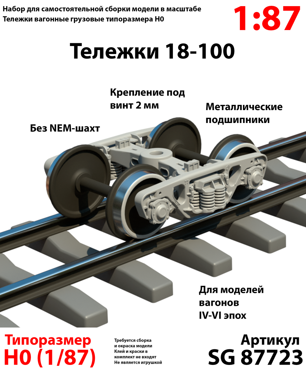 Студия SalivanGreen анонсировала выпуск модельных тележек типоразмера H0 для моделей грузовых вагонов в масштабе 1:87. Пока заявлено два варианта тележек: классические советские (и российские) 18-100, соответствующие IV-VI модельным эпохам и современные 18-2129, разработанные совсем недавно. Первые подходят под широкий перечень моделей вагонов, активно эксплуатировавшихся в нашей стране с 60-х годов XX века и остающихся в строю по настоящее время на всем пространстве 1520. Последние соответствуют VI модельной эпохе, были разработаны Алтайским вагоностроительным заводом для своих вагонов, имеют повышенный срок службы, увеличенные межремонтные сроки. Тележки данного типа были сертифицированы в 2020 году. По оценкам союза «Объединение вагоностроителей» (ОВС), сегодня на сети РЖД на тележках 18-100 и их аналогах работает 75% парка (более 1 млн грузовых вагонов). Тележка 18-100 была создана на основе американских конструкционных решений в 1955 году и продолжает применяться в современном пр