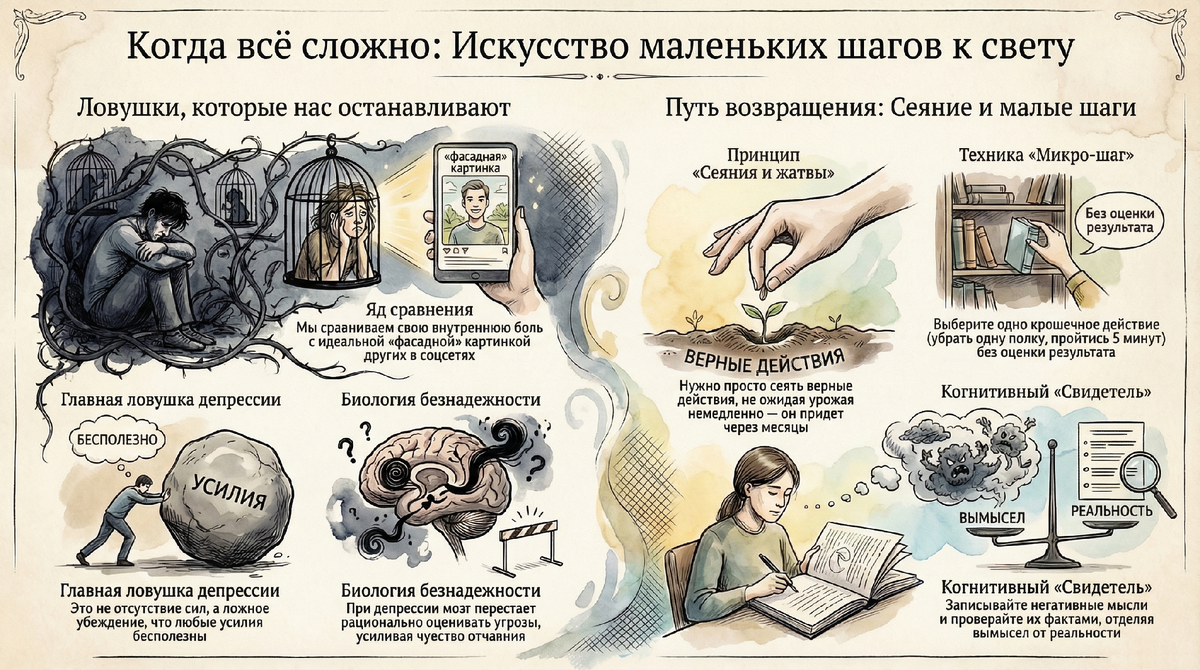 Главная ловушка депрессии — не в отсутствии сил, а в убеждении, что любые усилия бесполезны. Это убеждение можно разобрать, как старый механизм, и собрать заново.