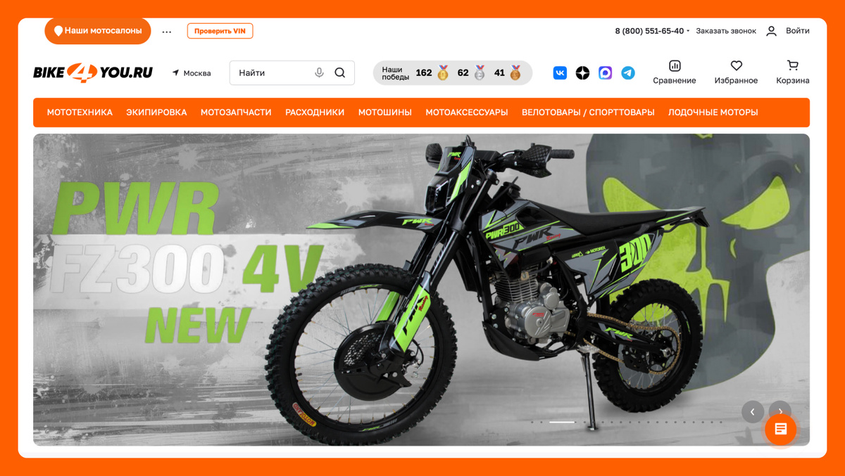Наш клиент bike4you.ru – сеть мотосалонов с офлайн-точками по России. Сайт используется как полноценный инструмент продаж: он должен не только показывать ассортимент, но и поддерживать работу менеджеров, интегрироваться с 1С и помогать закрывать сделки. На старте проект уже был реализован на Аспро: Максимум, но клиент хотел получить более современный дизайн сайта и иметь обновленные функции под задачи проекта. Наша задача заключалась в том, чтобы обновить платформу, стабилизировать работу сайта и адаптировать его под реальные сценарии продаж (онлайн + офлайн). В рамках проекта выполнили комплекс работ: Первым шагом стал переход на более современное решение. Это было необходимо, чтобы снять ограничения предыдущей платформы. В процессе миграции мы аккуратно перенесли структуру и данные, чтобы не потерять позиции в поиске и сохранить привычную логику для пользователей. После перехода сайт стал более устойчивым и готовым к дальнейшим доработкам. Ключевая проблема проекта заключалась в нес