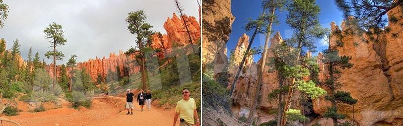 В ущельях национального парка Брайс-Каньон, где высокие скалы смыкаются с двух сторон, произрастают одни из самых высоких деревьев на юго-западе Америки – сосна пондероса (Pinus ponderosa). Многие деревья этого вида имеют диаметр ствола более трех метров и достигают около 45 метров в высоту, стремясь подняться над окружающими скальными образованиями. Латинское название Pinus ponderosa переводится как «сосна тяжелая». Оно происходит от плотности и веса древесины. Этот вид служит основным источником пиломатериалов в регионе юго-запада Америки. Деревья предпочитают сухие, хорошо дренированные горные склоны и каньоны. Их опознают по массивным, прямым стволам, покрытым чешуйчатой корой оранжевого оттенка, которая приобретает форму больших «шапок». Еще один отличительный признак – специфический запах. Кора сосны пондероса источает аромат, напоминающий ваниль или ирис. Эти сосны повсеместно встречаются по всему парку Брайс-Каньон. Практически на любой тропе, ведущей через парк, можно наткнуть
