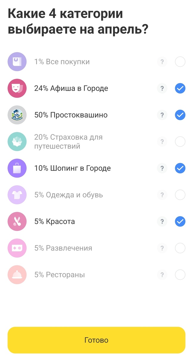 На удивление, есть что выбрать. Взяла с удовольствием кеш 2% на всё (иногда прям очень спасает), 7% кафе и рестораны сюдааа, 3% супермаркеты (пригодится, когда исчерпаю лимит в Альфе), ну и кеш на такси тоже всегда приятен.