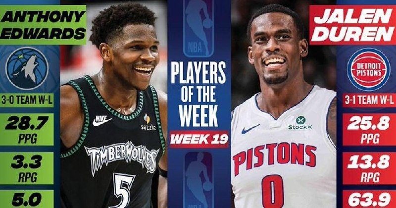 Защитник «Миннесоты» Энтони Эдвардс и центровой «Детройта» Джейлен Дюрен стали лучшими игроками недели на Западе и на Востоке соответственно. Эдвардс на прошедшей неделе набирал в среднем 28,7 очка, 3,3 подбора и 5 передач, помогая «Тимбервулвз» выиграть три матча. Дюрен при показателях 25,8 очка и 13,8 подбора с 63,9% реализации бросков с игры помог «Пистонс» завершить неделю 3-1.