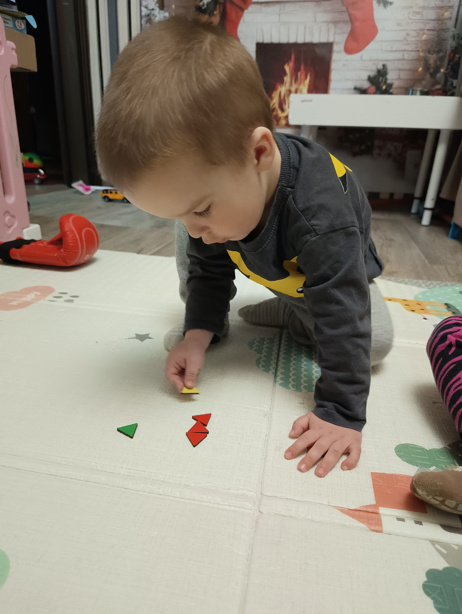Ну и свои фантазии уже проявили. Сева по образцу не выкладывает еще. Зато рисунки из фигурок делал. Треугольники сложил друг под другом, говорит, во, ёлочка получилась. Дед показал ему, как шестиугольник сложить, Сева моментально повторил. Потом домик сам сложил. Потом еще нафантазировал.