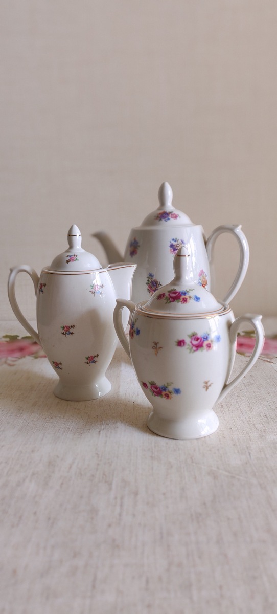 Добрый день. Сегодня я продолжу показывать фарфор Первомайского завода (Песочное) из моей коллекции. И сегодня речь пойдет об изящном кофейном фарфоровом наборе. Автор этой формы Паламарчук Михаил Фомич (1911-1985). Все предметы этого мастера у меня с изящной деколью «Русский ситчик». Может есть другое официальное название, напишите, пожалуйста, в комментариях. Буду признательна! Поскольку собирала я эти предметы в разных местах, то и деколь у них разная. Разные и клейма. Большой кофейник 3 сорта без золотой отводки. Но только такой я смогла раздобыть. Он немного наклонен вперед, но не стал от этого менее прекрасным. У кофейных чашек нет блюдец. Буду пытаться найти такие же, а вот просто подбором от других сервизов в этом случае заниматься не буду, потому как не предполагаю пользоваться этим набором. Это в коллекцию. На заводе выпускались сервизы такой формы с авторской росписью художников завода. Это великолепные экземпляры. Их фото можно найти в интернете и на сайте Рыбинского музе