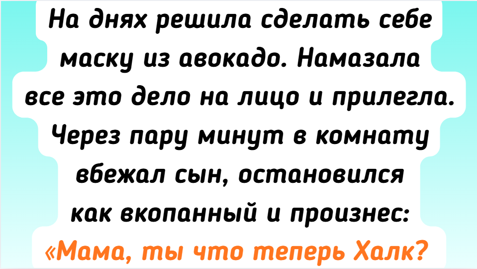 - На днях решила сделать себе маску из авокадо. Намазала все это дело на лицо и прилегла. Через пару минут в комнату вбежал сын, остановился как вкопанный и произнес: «Мама, ты что теперь Халк? Только в женском варианте?» Я еле сдержалась, чтобы не рассмеяться.
