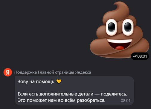 (ну почти) ЗАКИДАТЬ БОТА КАКАШКАМИ 🥳💩 Здесь я бился с ботом, чтобы он меня перебросил на поддержку Дзена (ничего не открывалось). Бот закидывал меня ссылками на страницы поддержки самого яндекса, которые возвращали 404 🤦♂️ Я только потом сам вспомнил, что дзен уже не принадлежит яндексу (о чём тупой бот мог бы мне и сказать). ну, поддержка яндекса — это вообще отдельная песня. кстати, человек в чат так и не пришёл… но может какахи были мелкие 😉 #юмор