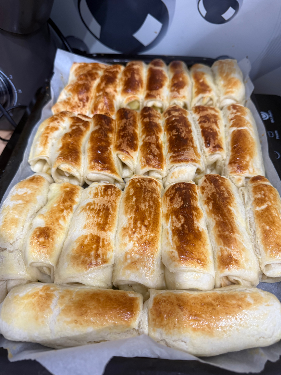 Тесто нарезать на квадратики и с помощью скалки раскатать. Далее на краешек теста положить начинку и закрутить. Все просто…