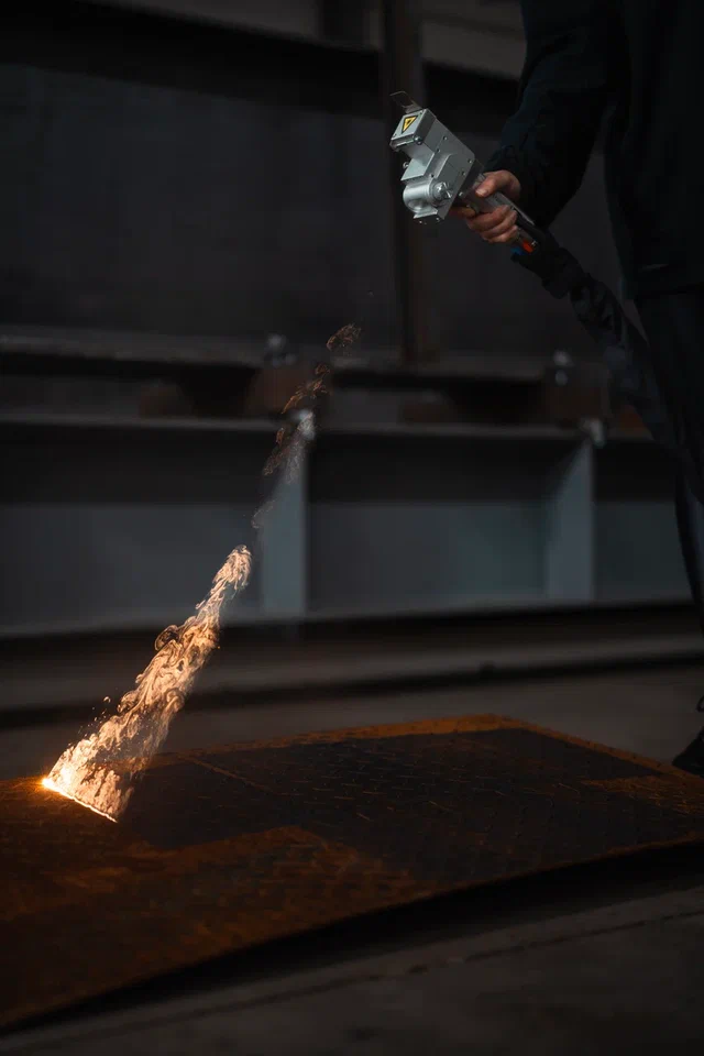 Принцип прост, но физика за ним — серьёзная. Лазерный луч с длиной волны 1064–1080 нм направляется на загрязнённую поверхность. Ржавчина, окалина и оксиды поглощают энергию лазера значительно лучше, чем сам металл. Это ключевой момент: поверхностный слой загрязнений мгновенно нагревается и испаряется, а основной металл при этом остаётся нетронутым.