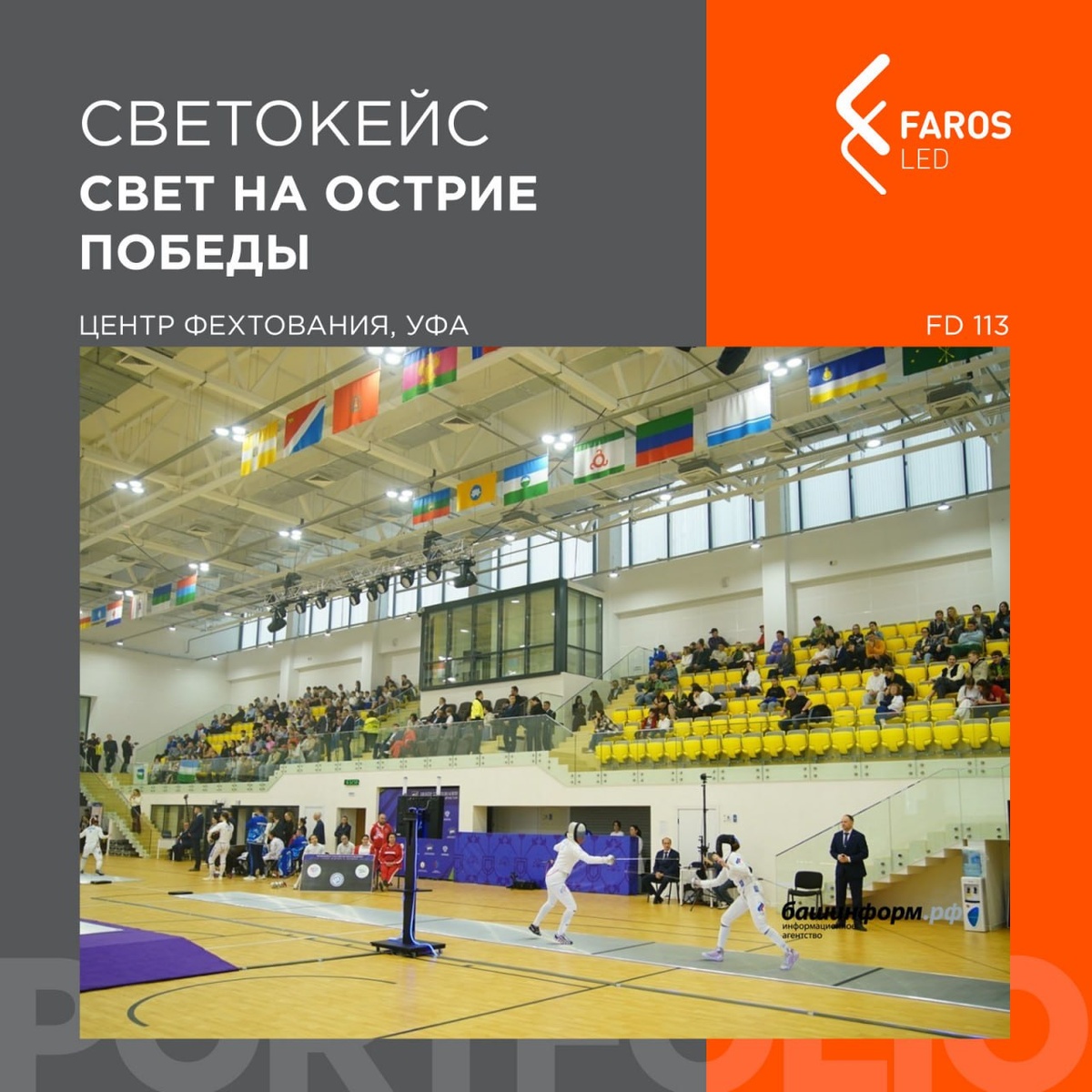 ☄️ Российский производитель профессиональной светотехники FAROS LED осветил Центр фехтования в Уфе. Площадь спортивного комплекса: 6200 м². В просторном двухэтажном здании оборудован фехтовальный зал на 28 дорожек, зал соревнований с трибунами на 373 зрителя, тренажерные залы. 🤺 Специалисты FAROS LED обеспечили качественное, долговечное и энергоэффективное освещение двух ключевых зон: • Специализированного фехтовального зала площадью 999 м² для тренировок до 32 спортсменов. • Универсального зала 42×24 м для соревнований по разным видам спорта. 💫 Для спортивных объектов критически важны равномерная засветка без теней и бликов, высокая освещенность и соответствие нормативам. 🛡 Для освещения спорткомплекса были выбраны подвесные светильники FD 113 с высокой защитой IP65. Они сочетают высокую световую эффективность, надежность и продуманный функциональный дизайн. Всего на объект установлено 127 светильников ТМ ФАРОС. ⚙️ Индустриальный дизайн FD 113 сочетает эффективный термоменеджме