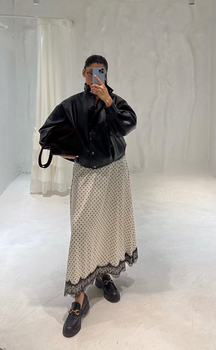 И поговорим о стилизации, которая сейчас буквально бьет все рекорды по популярности – это легкая воздушная юбка в сочетании с ветровкой или кожаной курткой.