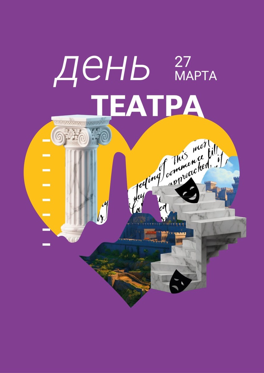 27 марта — это День театра И у меня есть постер, посвященный этому дню🎭 Поделюсь, как строится метафорический ряд в этой работе: Сердце в качестве центрального образа здесь не анатомический орган, а вместилище чувств, ритмов и превращений. Внутри силуэта ❤️ движутся слои, сменяя друг друга как театральные декорации. Один из них выполнен из стилизованной каллиграфии на старой бумаге (отсылка к рукописной природе драматургии, к перу и чернильнице, к тексту, который оживает на сцене). Слои не статичны. Они сдвигаются, создавая ритм кардиограммы и пульс театрального действия. Слева от сердца расположена шкала, напоминание о том, что в театре мы проживаем весь спектр эмоций: от тишины до крика, от боли до катарсиса. Эту же идею развивает лестница. Шагая по ней вверх или вниз, от пессимизма к оптимизму, мы приближаемся к традиционным символам театра — маскам. Пространство постера построено на контрасте плоскостных и объемных элементов. Лестница и колонна создают глубину, соединяясь с плоски