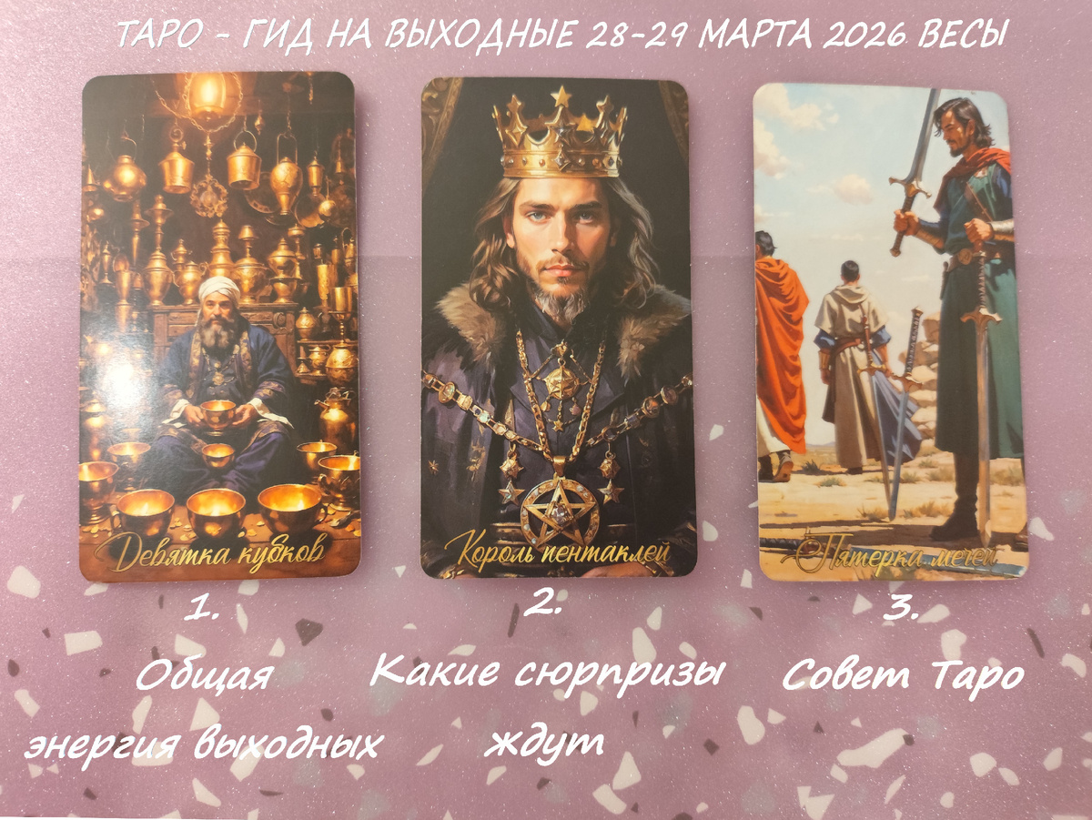 Идеальное настроение выходных: праздник души, гармония, исполнение желаний. Карта «9 Кубков» (Девятка Кубков), известная как «Карта Желаний», обещает период радости, удовлетворения и приятных событий — именно то, что нужно уравновешенным и эстетически настроенным Весам. Астрологически карта связана с Луной в Тельце — это подчёркивает темы комфорта, уверенности и заботы о себе и близких. Весы (23 сентября — 22 октября) — знак гармонии, красоты и партнёрства. Под влиянием «9 Кубков» выходные станут временем: В сфере общения и отношений: Для наслаждения моментом: В практическом плане: «Король Пентаклей» для Весов — это: Главный урок карты: истинное изобилие рождается там, где мудрость сочетается с щедростью. Позвольте себе наслаждаться плодами труда — и делитесь ими с другими. «5 Мечей» на выходные Основной совет: не форсируйте конфликты и не вступайте в споры. Сейчас важно сохранять хладнокровие и не усугублять ситуацию эмоциональными реакциями. Конкретные рекомендации: Всем пока! Пусть