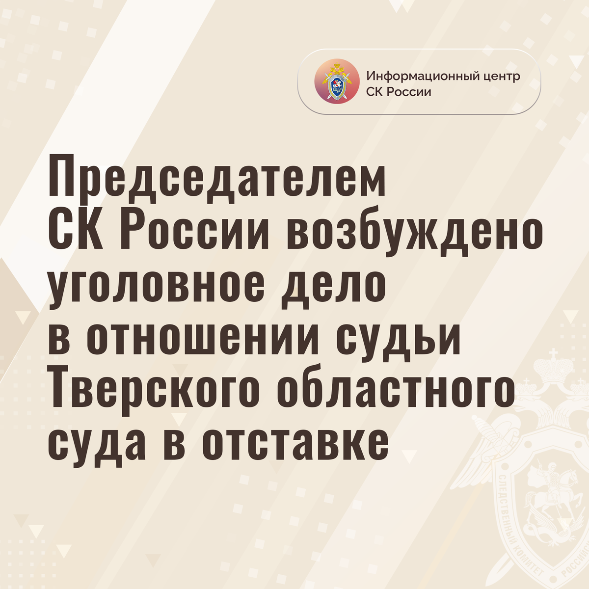 Председателем СК России возбуждено уголовное дело в отношении судьи Тверского областного суда в отставке Председателем Следственного комитета Российской Федерации Александром Ивановичем Бастрыкиным с согласия Высшей квалификационной коллегии судей Российской Федерации возбуждено уголовное дело по факту мошенничества, то есть хищения чужого имущества путем обмана, совершенного лицом с использованием своего служебного положения, в особо крупном размере в отношении судьи Тверского областного суда Владимира Колпикова в отставке (ч. 4 ст. 159 УК РФ). По данным следствия, в 2022 году Колпиков, осведомленный о расследовании в органах МВД России уголовного дела в отношении двух жителей города Твери, при посредничестве адвоката предложил оказать содействие в изменении квалификации действий обвиняемых по менее тяжкой статье УК РФ и меры пресечения на несвязанную с лишением свободы. Не намереваясь исполнять взятые на себя обязательства, судья получил от родственников обвиняемых 10 млн рублей. Де