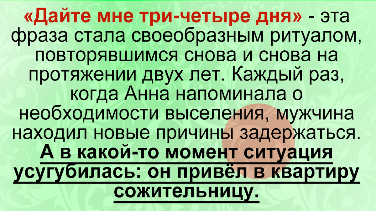 «Дайте мне три‑четыре дня» — эта фраза стала своеобразным ритуалом, повторявшимся снова и снова на протяжении двух лет. Каждый раз, когда Анна напоминала о необходимости выселения, мужчина находил новые причины задержаться. А в какой‑то момент ситуация усугубилась: он привёл в квартиру сожительницу.