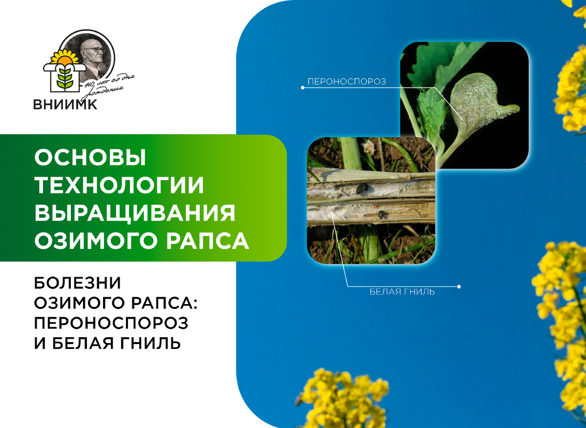 Пероноспороз, или ложная мучнистая роса, считается одной из наиболее распространённых болезней озимого рапса. Осенью поражается около 30 % листьев, весной – 20–80 %. Если поражение происходит в начальный период развития культуры, растение погибает. Представляет особую опасность в районах с достаточным увлажнением. При поражении стручков ложной мучнистой росой масса 1000 семян снижается в 1,5 раза, масличность семян – на 5–10 %. При интенсивном развитии болезни недобор зелёной массы рапса может составлять 15–25 %. Недобор урожая семян при умеренном развитии болезни может достигать 10–20 %, а в годы эпифитотий – 40–50 %. Белая гниль поражает, кроме рапса, ещё более 300 видов растений, относящихся к 64 семействам однодольных и двудольных. Потери урожая семян рапса при интенсивном развитии этой болезни могут достигать 50 %. При поражении склеротиниозом стручков масса 1000 семян снижается в три раза. Белая гниль резко снижает качество зелёной массы рапса. Источник инфекции – склероции патог