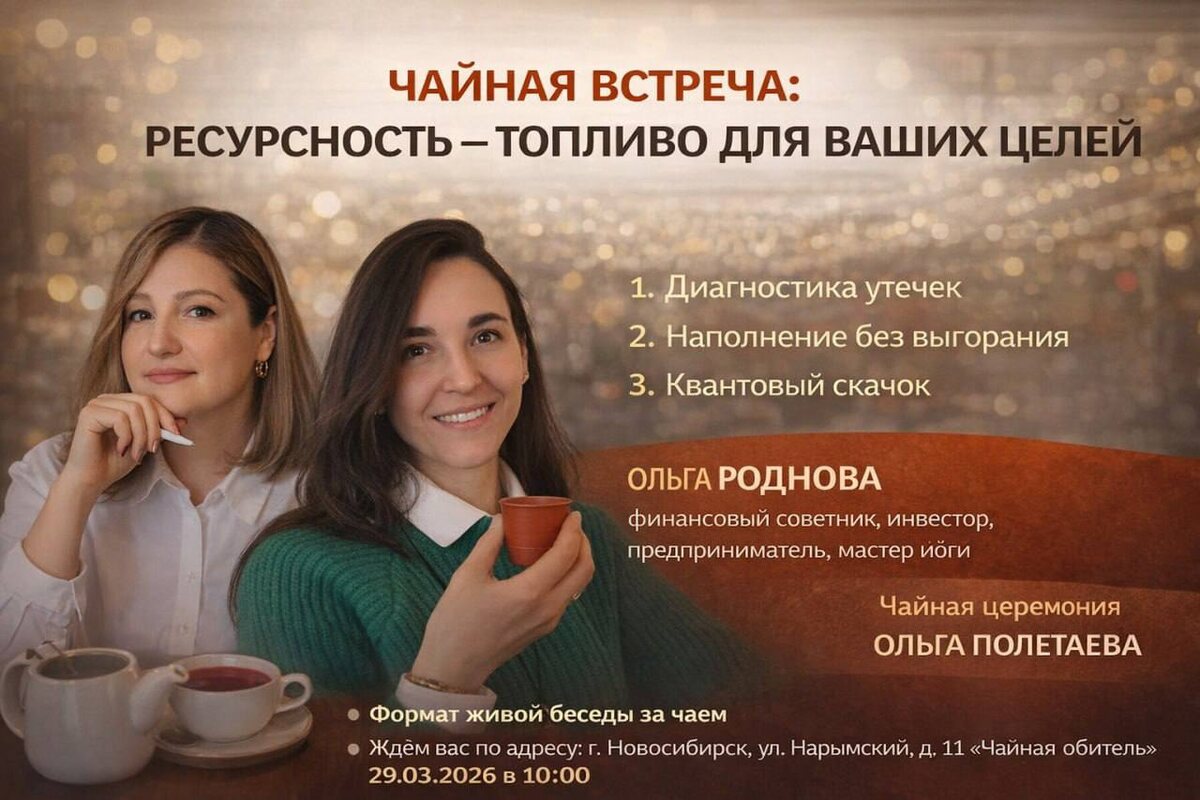 Замечали: когда внутри есть силы, всё получается легче. А когда сил нет — даже маленькие шаги даются с трудом. Мы привыкли думать, что дело в тайм-менеджменте, в мотивации, в «правильных» целях. Но часто корень — в том, куда уходит наша энергия и как мы её восстанавливаем. Приглашаем вас на уютную встречу, где мы честно и бережно поговорим о ресурсности. ⤵️ 💡 Три темы встречи: 1⃣Диагностика утечек. Что и кто крадёт вашу энергию незаметно? Те привычные сценарии, которые высасывают силы. 2⃣Наполнение без выгорания. Как быть в контакте с собой, чтобы энергия не утекала, а работала на вас. 3⃣Квантовый скачок. Что нужно, чтобы перейти из состояния «выживания» в состояние «реализации» своих целей — быстро и без насилия над собой. 🎙 Ольга Роднова — спикер встречи: Финансовый советник, инвест- брокер, инвестор, предприниматель. Прошла путь от потери всего до создания своей системы по выходу из кризиса, где ресурс и финансы идут рука об руку. ☕️ Проведёт чайную церемонию Ольга Полетаев