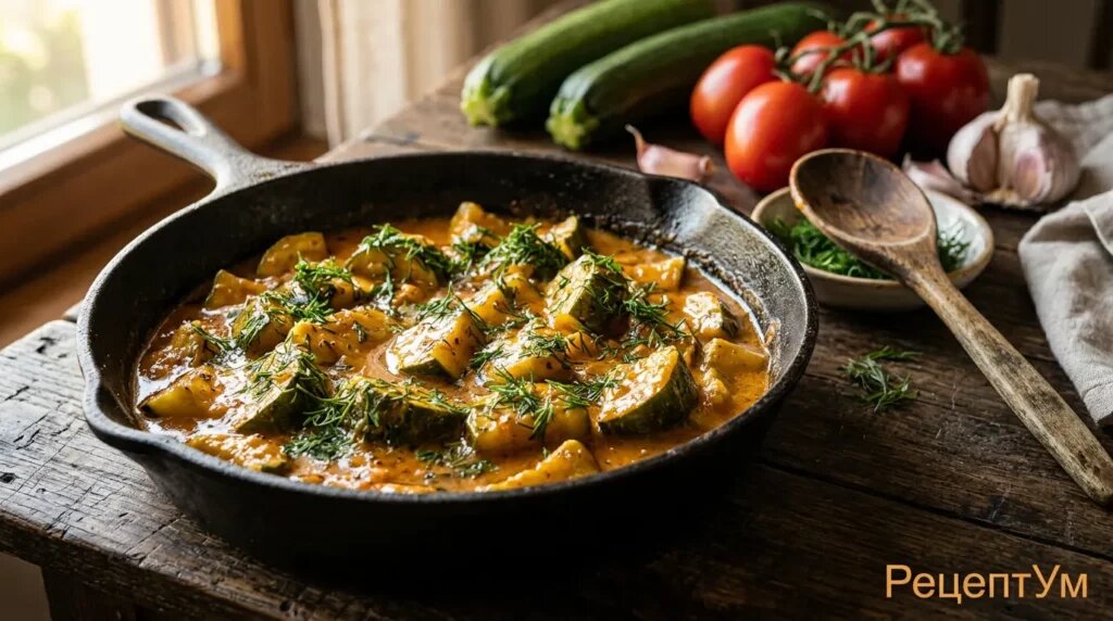 Всё решает один шаг, который большинство пропускает: просолить кабачки заранее. Они сами выделяют сок, он выпаривается со специями и превращается в насыщенный соус — без добавления воды, без крышки в финале. Кусочки остаются целыми, вкус — концентрированным.