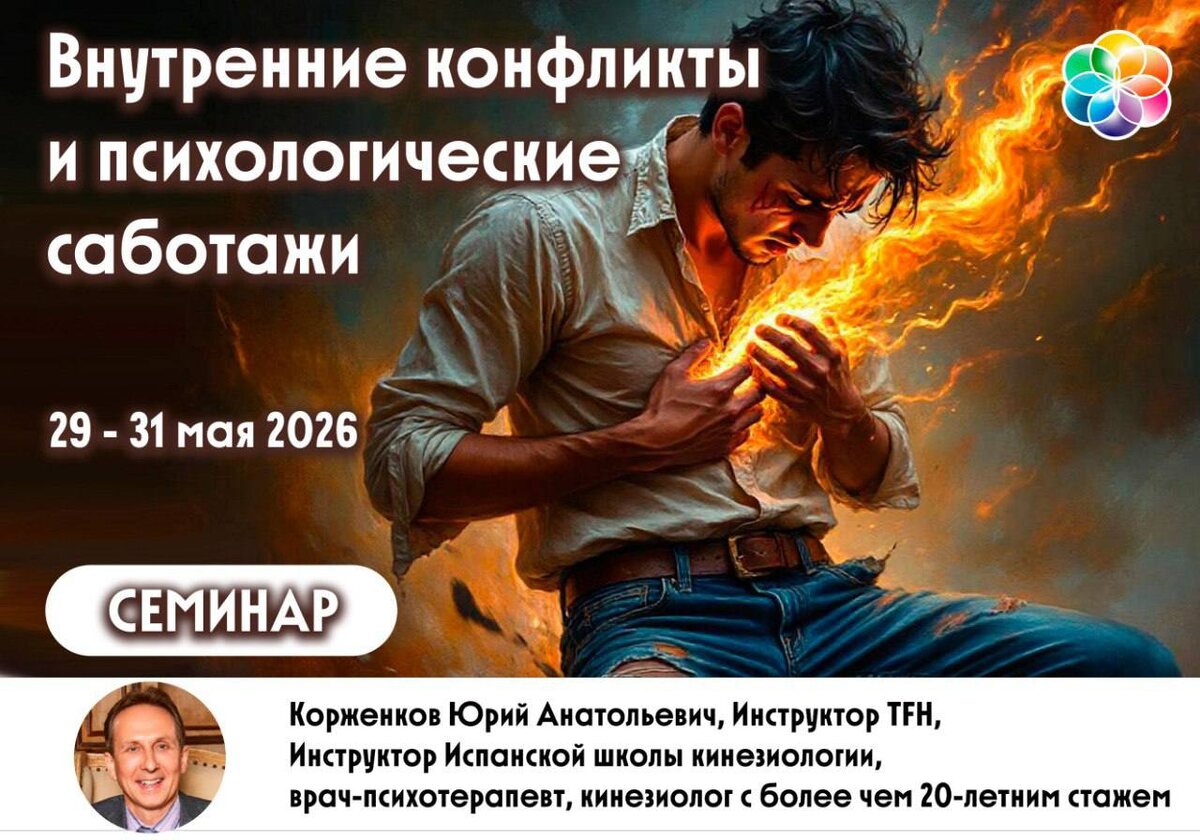 ! 🌿 Бывает такое: вроде и цель есть, и силы, и возможности, но что-то внутри постоянно тормозит? Мы сами отказываемся от выгодных предложений, выбираем «не тех» людей или саботируем собственный успех, даже когда финишная прямая уже видна. Это не просто лень. Это психологический саботаж — невидимая программа, которая заставляет нас идти не своим путем. Приглашаем вас на глубинный Авторский семинар «Внутренние конфликты и психологические саботажи», чтобы разобраться с этими механизмами раз и навсегда. 👤 Ведущий: Корженков Юрий Анатольевич 📅 29 - 31 мая 2026, 10:00 - 18:00 В программе семинара: - Выявление скрытых убеждений, которые заставляют нас идти по чужому пути. - Прояснение механизмов внутреннего саботажа. - Уникальная практика работы с картами И-ЦЗИН (триграммы и гексаграммы) для коррекции подсознательных программ. Семинар для вас, если вы замечаете за собой: 🔹 Выбор заведомо неудачных сценариев при наличии лучших. 🔹 Чувство вины или апатию в моменты позитивных событи