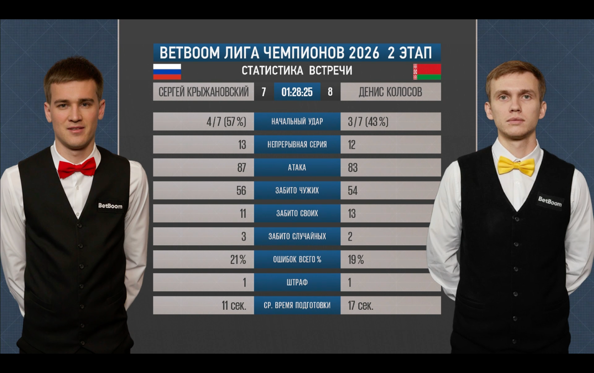 Матчи на выбывание всегда несут в себе особую энергетику. Вчерашняя встреча нижней сетки BetBoom Лиги чемпионов 2026 стала настоящим украшением турнира, вместив в себя спортивное благородство, технические форс-мажоры и сумасшедшую статистику. Роковое «ДТП» и честная игра Игроки начали встречу осторожно, не отпуская друг друга в отрыв. При счете 3:3 произошел эпизод, перевернувший игру: у Крыжановского отлетает наклейка на кие. В бильярде это сродни потере колеса на гоночном болиде. Денис Колосов проявил уважение к сопернику и одолжил свой кий. Но чужой инструмент моментально сказался на психологическом состоянии Сергея. Камбэк на морально-волевых Колосов, почувствовав неуверенность соперника, довел счет до комфортных 7:4. До победы оставался один шаг. Но бильярд не прощает потери концентрации. Денис допускает досадную ошибку, и Крыжановский, даже находясь в тяжелейшем положении, собирает волю в кулак, наказывая Колосова и доводя счет до невероятных 7:7. О чем говорят цифры? Статистика