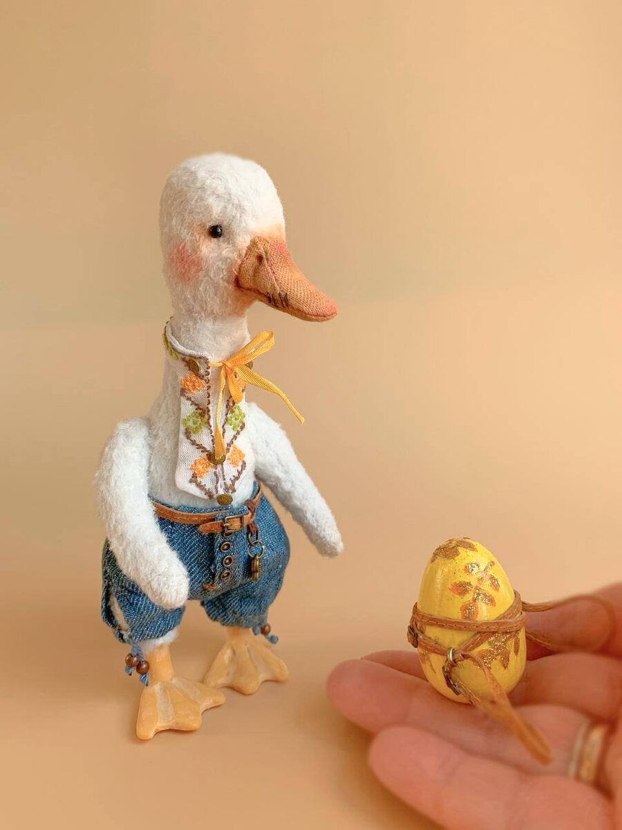 Рост 14, 5 см Сшить из немецкой вискозы. Лапки из полимерной глины. Набит опилками. Для приятного утяжеления добавлены металлические гранулы. Голова и лапки подвижные на дисках и шплинтах, глазки стеклянные. Одежда сшита из хлопка, снимается. Гусик украшен деревянным яичком, которое держится на кожаных ремешках. Стоит уверенно. Задуман как пасхальный подарок! Пусть гусик принесет вам радость! 9500₽+доставка 🚗🎁🧡