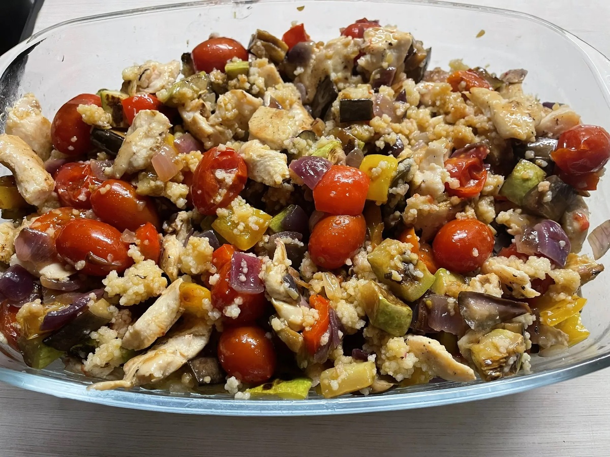 Приветствую всех моих любимых поварят! 🥰 Сегодня предлагаю приготовить яркий, сочный и очень полезный салат — с курицей, овощами и кус-кусом. О пользе овощей мы все, конечно же, знаем. Но, к сожалению, не все их любят. А всё потому, что просто не умеют готовить их так, чтобы они оставались вкусными и сохраняли свою пользу! Сегодня я покажу, как это сделать. Поехали! Нам понадобится: Важное предупреждение ⏰ Сразу хочу предупредить: это блюдо займёт достаточно много времени, поэтому лучше запланировать его приготовление на выходной день, когда можно никуда не спешить и наслаждаться процессом. Готовим по шагам 👩🍳 1. Подготовка овощей и курицы 🥒🍆🍗 Нарезаем все овощи и куриное филе кубиками. Каждый ингредиент будем обжаривать отдельно. 2. Обжариваем без масла 🔥 Обжариваем овощи без добавления масла до полуготовности на хорошо разогретой сковороде с антипригарным покрытием или на гриле до золотистого цвета. Наша цель — чтобы овощи остались слегка хрустящими и сохранили свою текстуру