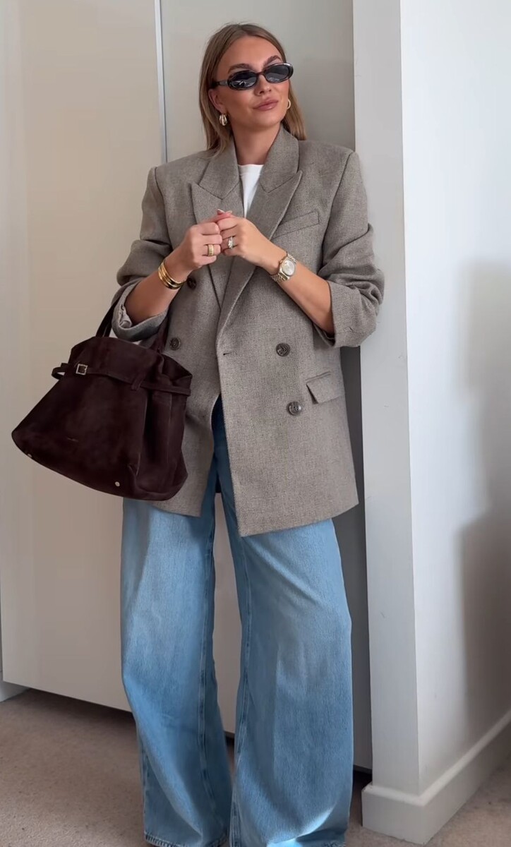 - Прямые джинсы с высокой талией. Это идеальный партнер для оверсайз-жакета. Высокая талия «соединяется» с краем жакета, создавая длинную линию. Прямой крой не перетягивает внимание, а работает как нейтральная база.