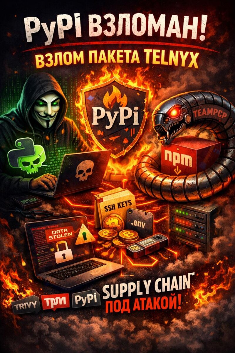 Теперь под ударом пакет telnyx Очередной удар по supply chain от TeamPCP. И это уже не единичный случай - это целая атака по экосистеме разработчиков. Что произошло: • Популярный Python-пакет telnyx на PyPI был скомпрометирован • Вредоносный код внедрили прямо в официальные версии • Payload срабатывает при обычном import — без действий пользователя Что делает malware: • крадёт SSH-ключи, токены, .env, криптокошельки • шифрует и отправляет данные на сервер злоумышленников • закрепляется в системе (persistency) • может распространяться дальше по инфраструктуре Это не просто вредоносный пакет - это полноценаая атака: 1. Сначала взломали Trivy (инструмент безопасности) 2. Через него украли токены CI/CD 3. Затем заразили npm (CanisterWorm) 4. Потом PyPI (LiteLLM, telnyx и др.) :contentReference[oaicite:2]{index=2} 👉 Один заражённый пакет = полный доступ к инфраструктуре Теперь правило №1: • фиксируй версии (pin dependencies) • проверяй хэши • не доверяй последним релизам вслепую Э