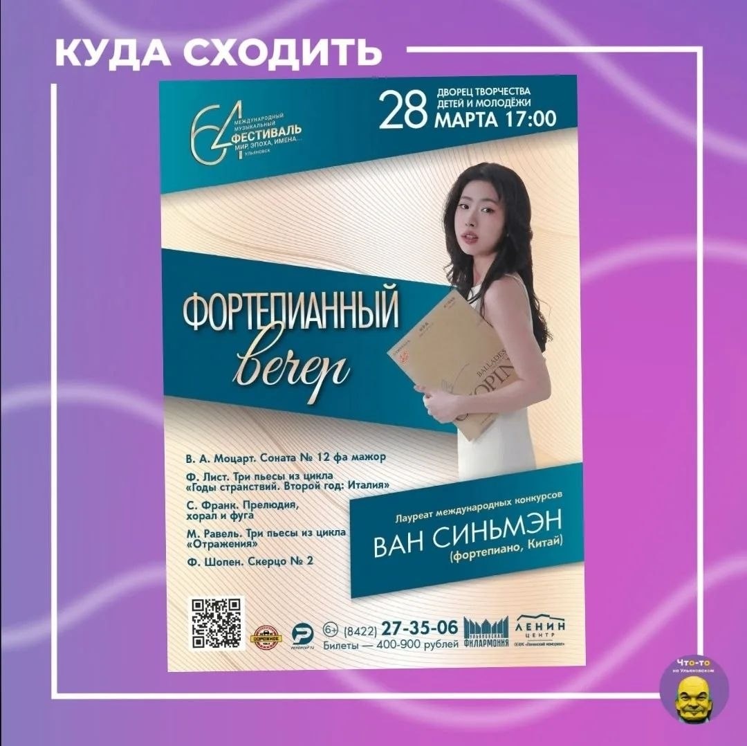 "🎹 Ван Синьмэн родилась в 2002 году. Окончила среднюю школу при Шэньянской консерватории в Китае, в настоящее время учится в Московской государственной консерватории им. П. И. Чайковского в классе Юрия Валерьевича Диденко. 📅 Когда: 28 марта в 17:00 📍 Где: Дворец творчества детей и молодёжи (ул. Минаева 50) #куда_пойти_ул