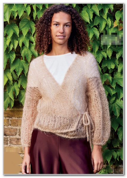 Этот тонкий жакет с запахом нежно облегает тело, даря ощущение легкости и заботы. Для работы используется эксклюзивная, объемная мохеровая пряжа с добавлением металлизированной нити люрекса, которая создает сдержанный и элегантный эффект мерцания.