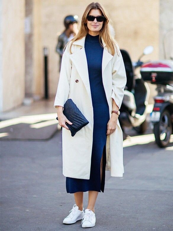 - Длина платья - миди или макси. Короткое платье + кроссовки = ноги выглядят короче, чем они есть. Миди открывает самую узкую часть ноги (щиколотку) и балансирует массивность обуви.