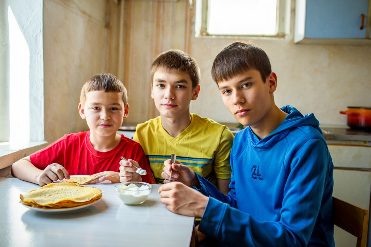 Через пять минут на кухне было шумно, тесно и пахло маслом и тестом. Артём уже успел залезть на табуретку и заглядывал на сковородку с видом эксперта. Илья рассказывал что-то про физкультуру. Никита ставил тарелки — сам, без просьбы.