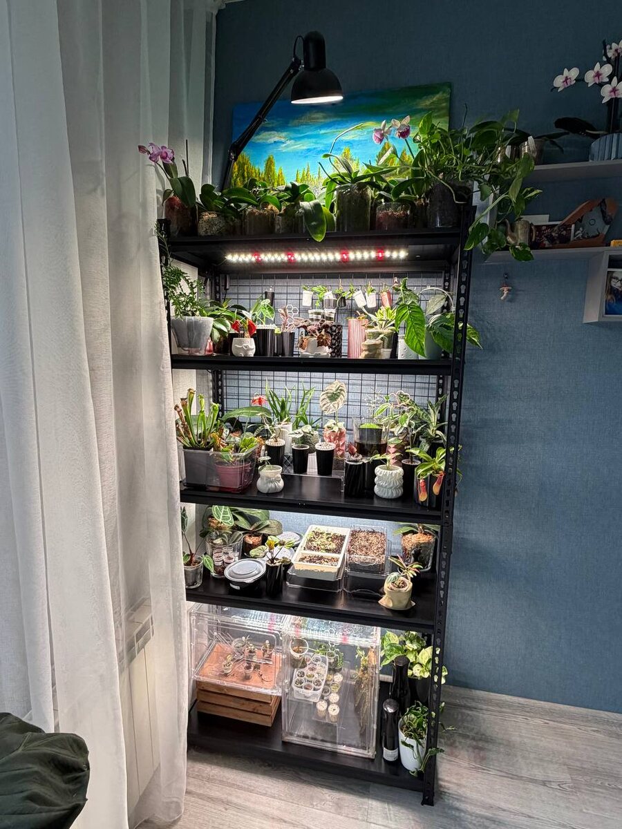 Поставила минифермер на оставшиеся две полки и убрала коврики с полок. Поняла, что нет в них смысла: вода по краям затекает с них на фанеру, а у полок поверхность и так защищена, вопрос был именно в защите боковины. Картину поставила наверх, чтобы можно было опрыскивать орхидеи 😆