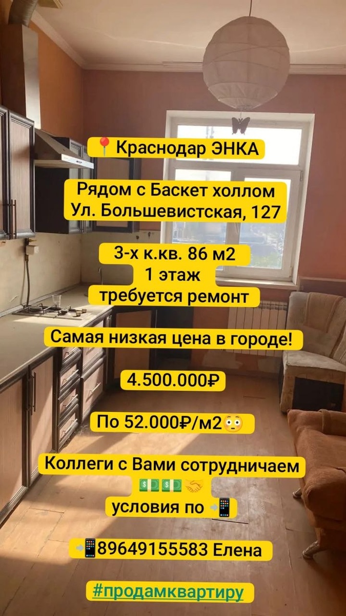 📍Краснодар ЭНКА Рядом с Баскет холлом Ул. Большевистская, 127 ➡️ Большая 3-х к.кв. 86 м2 ➡️ 1 этаж ➡️ требуется ремонт 🔝Самая низкая цена в городе! Новая цена: 4500.000₽ По 52.000₽/м2😳 ✅Квартира чистая 1 взрослый собственник! ✅Все центральные коммуникации! 📲89649155583 Елена #продамквартиру #недвижимостькраснодар #продам